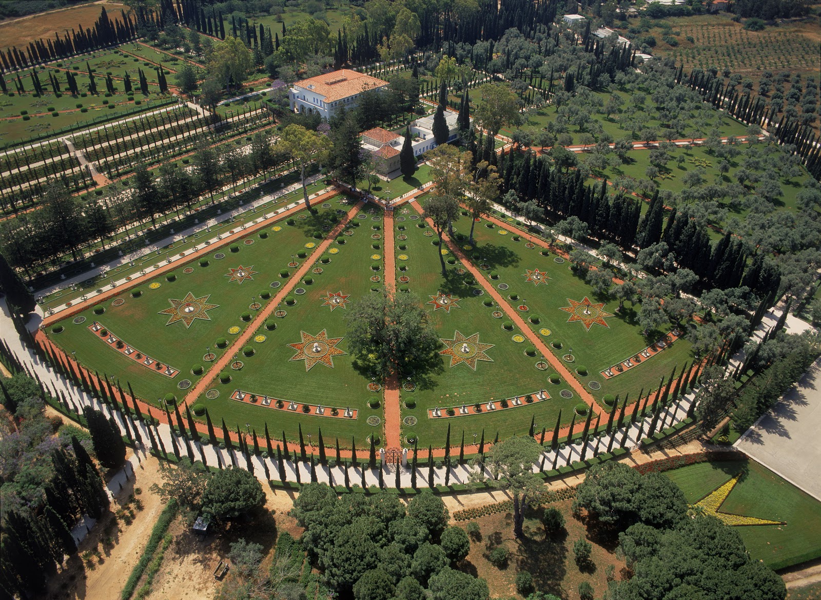 [Bahji - Aerial view of the Shrine of Bahá’u’lláh, Mansion of Bahjí and surrounding gardens]